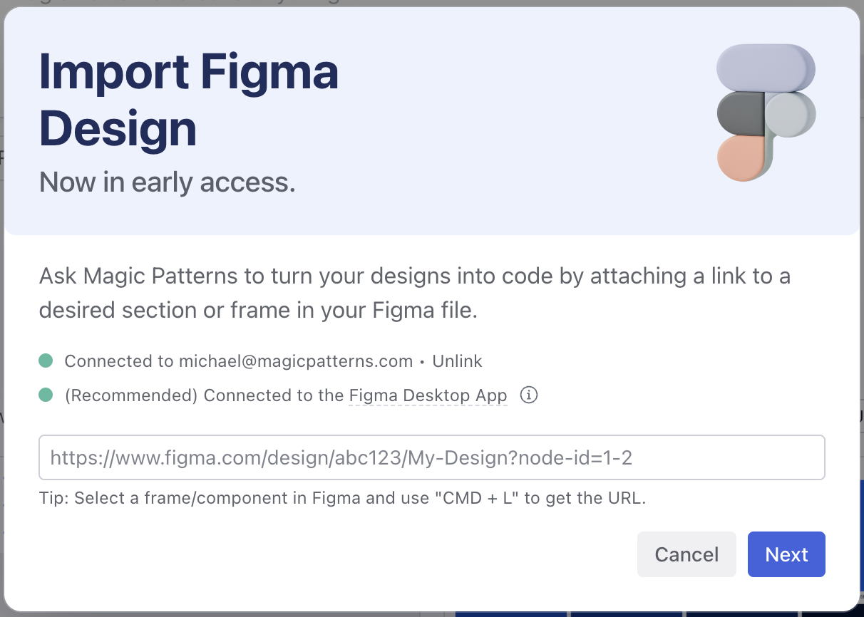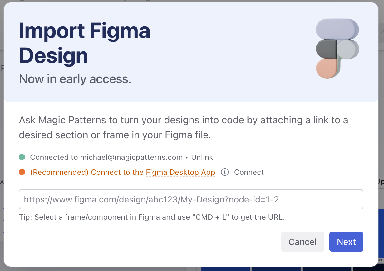 Paste the link into the Magic Patterns import dialog and click 'Next'