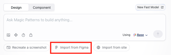 Our Import to Figma feature lets you bring designs from your project into Magic Patterns to make them interactive.Create a new design from the dashboard and click on the 'Import from Figma' button.