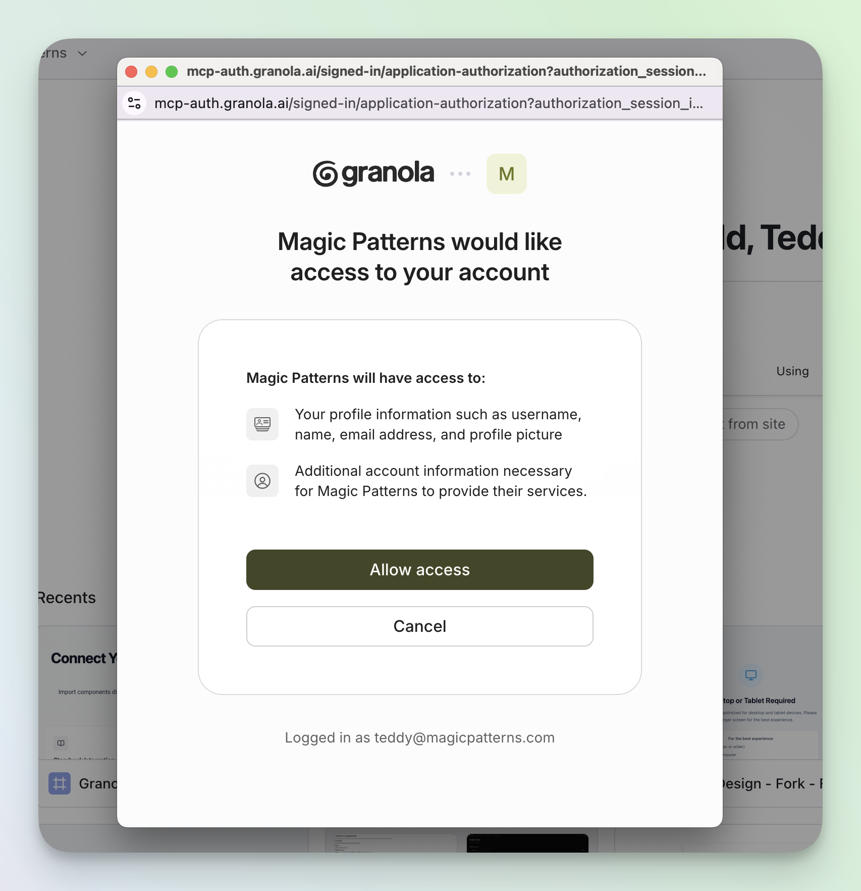 Click the connector you want to enable (e.g. Granola). An OAuth dialog will appear.