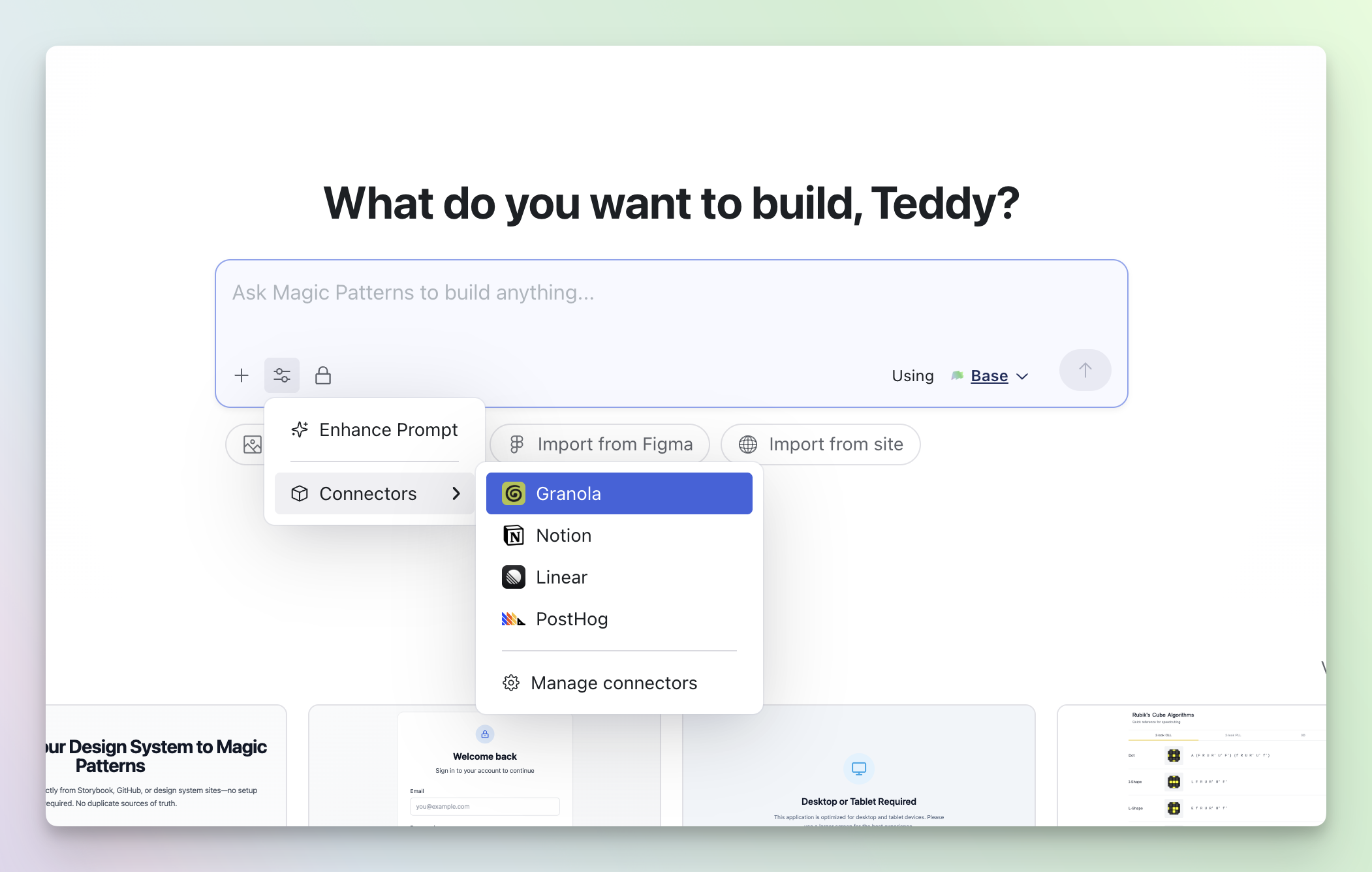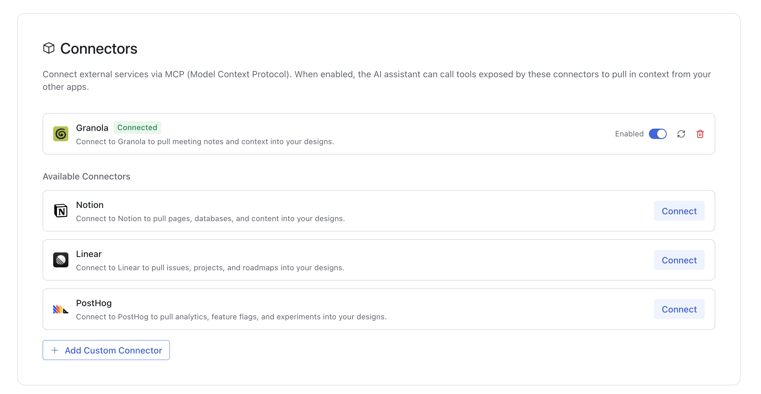 Connectors let Magic Patterns work with your external tools, databases, and applications to give you more relevant responses. Powered by the Model Context Protocol (MCP), connectors allow the AI assistant to pull in real context from the services you already use — like meeting notes, project issues, or analytics data — and incorporate it directly into your designs. When a connector is enabled, the AI assistant can discover and call tools exposed by the connected service. For example, if you connect Granola, the assistant can pull your recent meeting notes and use them to inform a design.Available Connectors