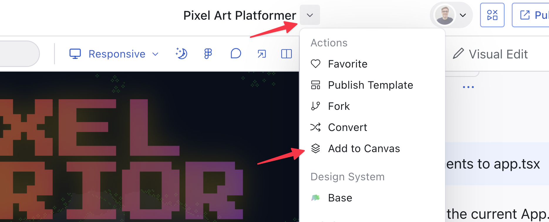 From an existing design: Click the button next to the title in the top nav bar → select “Add to Canvas”